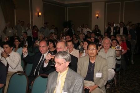Dr. H. John Caulfield (at the left of second row), 'One of America's 10 Top Scientists' (Business Week), and General Plenary Keynote Speaker toasting, with other attendees, for the award recipients