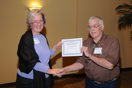 Dr. Jeremy Horne, Program committee Chair, giving Ms. Claudia Jennifer the best paper award of the session “ICT applications in Education and Training.”The title of the awarded paper is ''Making it Real: Faculty Collaboration to Create Video Content".