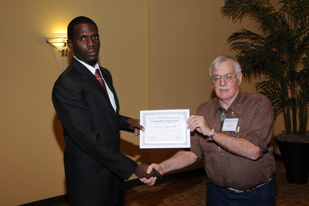 Dr. Jeremy Horne, Program committee Chair, giving Mr. R. Rock the best paper award of the session “ICT applications in Education and Training.” The title of the awarded paper is ''The 5th Umpire: Automating Cricket's Edge Detection System''.