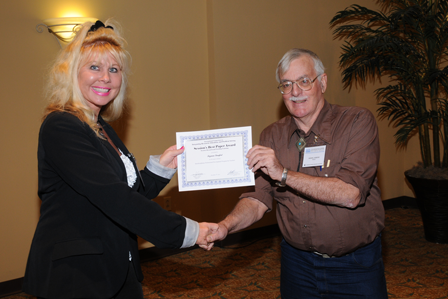 Dr. Jeremy Horne, Program committee Chair, giving Prof. Suzanne Lunsford the best paper award of the session “Research and Teaching/Learning” The title of the awarded paper is ''Interdisciplinary Professional Development Program for Teachers''.