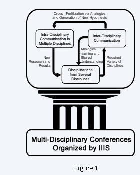 Multi-disciplinary conferences are organized by the IIIS as support for both intra- and inter-disciplinary communication. Processes of intra-disciplinary communication are mainly achieved via traditional paper presentations in corresponding disciplines, while conversational sessions, regarding trans- and inter-disciplinary topics, are among the means used for inter-disciplinary communication. Intra- and inter-disciplinary communications might generate co-regulative cybernetic loops, via negative feedback, and synergic relationships, via positive feedback loops, in which both kinds of communications could increase their respective effectiveness. Figure 1 shows at least two cybernetic loops if intra- and inter-disciplinary are adequately related. A necessary condition for the effectiveness of Inter-disciplinary communication is an adequate level of variety regarding the participating disciplines. Analogical thinking and learning processes of disciplinarians depend on it; which in turn are potential sources of the creative tension required for cross-fertilization among disciplines and the generations of new hypothesis. An extended presentation regarding this issue can be found at www.iiis.org/MainPupose.